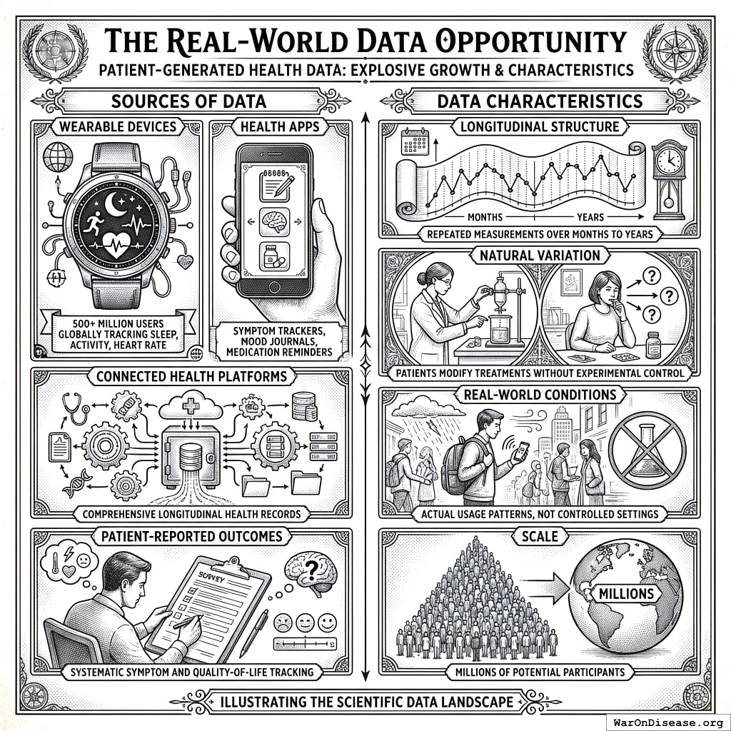 Current pharmacovigilance systems rely primarily on spontaneous adverse event reporting, which suffers from significant underreporting, lack of denominator data, and inability to quantify effect sizes. Meanwhile, the proliferation of wearable devices, health apps, and patient-reported outcomes has generated unprecedented volumes of longitudinal real-world data (RWD) that remain largely untapped for safety and efficacy signal detection.