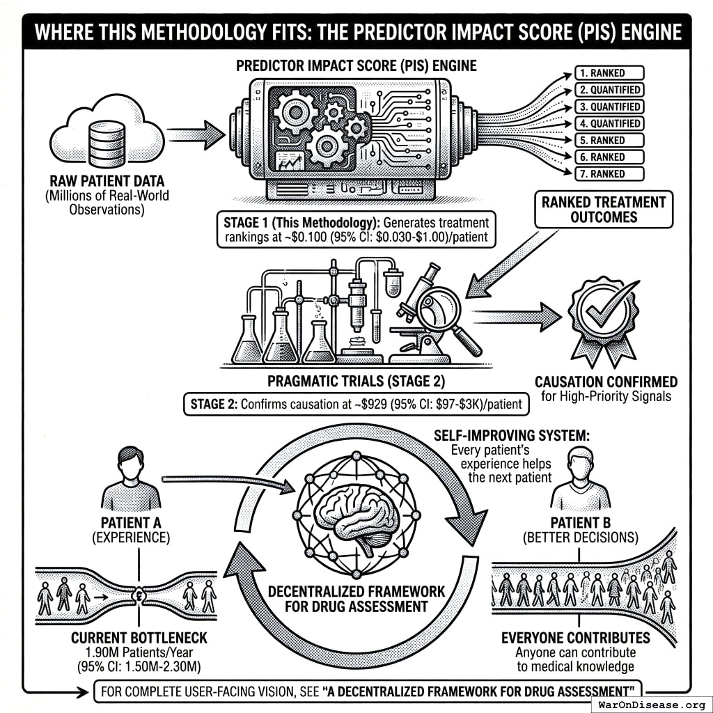 Stage 1 (Signal Detection): Aggregated N-of-1 observational analysis133,134 integrates data from millions of individual longitudinal natural experiments. The methodology applies temporal precedence analysis with automated hyperparameter optimization, addresses six of nine Bradford Hill causality criteria through a composite Predictor Impact Score (PIS), and produces ranked treatment-outcome hypotheses at ~$0.1 (95% CI: $0.03-$1).