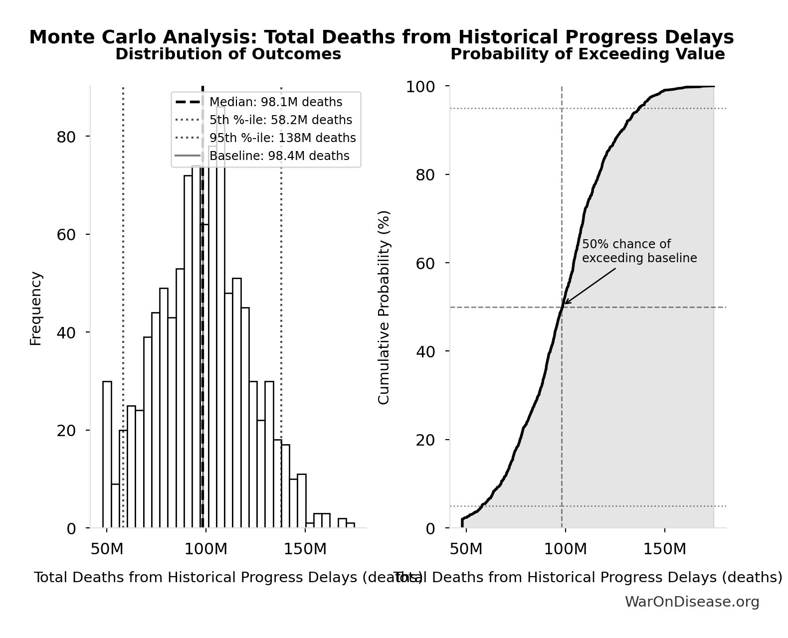 The histogram shows the distribution of Total Deaths from Historical Progress Delays across 10,000 Monte Carlo simulations. The CDF (right) shows the probability of the outcome exceeding any given value, which is useful for risk assessment.
