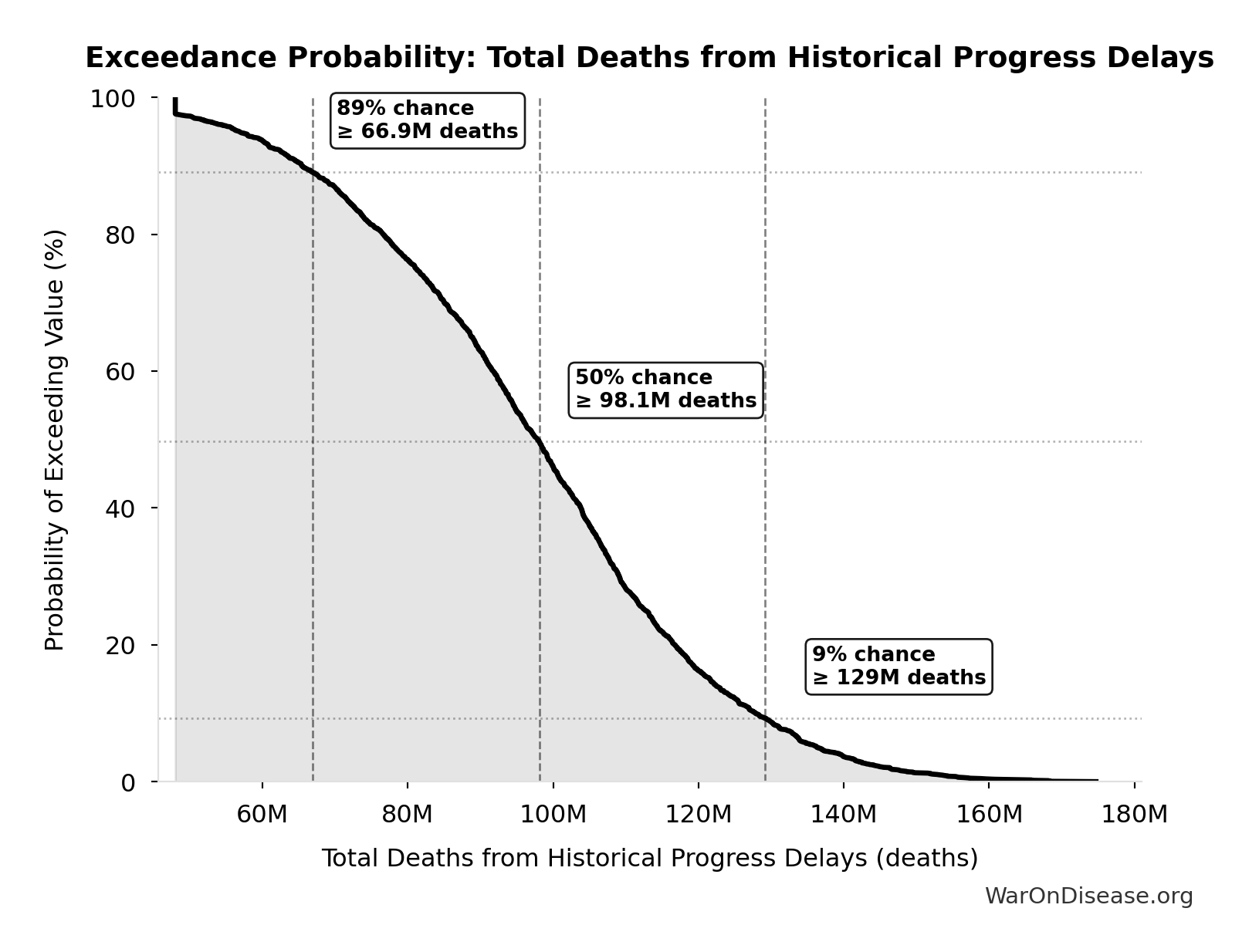This exceedance probability chart shows the likelihood that Total Deaths from Historical Progress Delays will exceed any given threshold. Higher curves indicate more favorable outcomes with greater certainty.