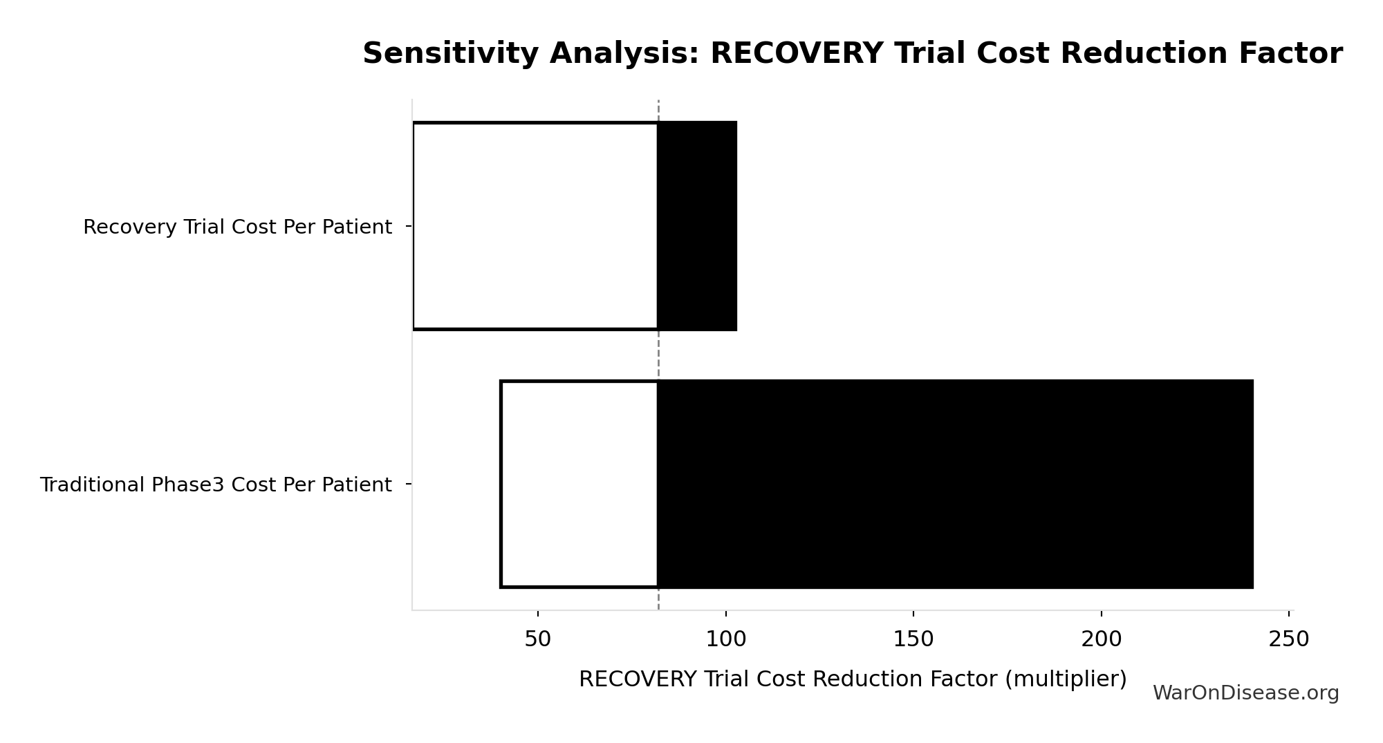 Cost reduction factor demonstrated by RECOVERY trial ($41K traditional / $500 RECOVERY = 82x)